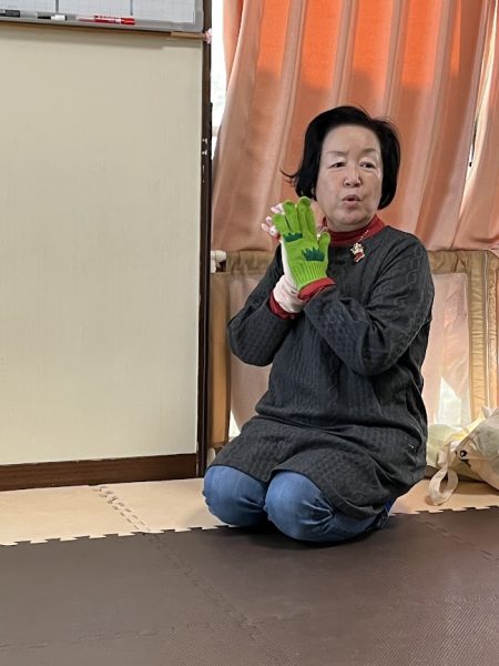 一番初めにうさぎの指人形(手袋の先にうさぎがいます🐰)を出すと、『いないいないばぁは だれでしょね』のうたに合わせて5匹のうさぎが隙間から出たり隠れたり👀✨子ども達はその様子をよくよく見ていました☺️💓
