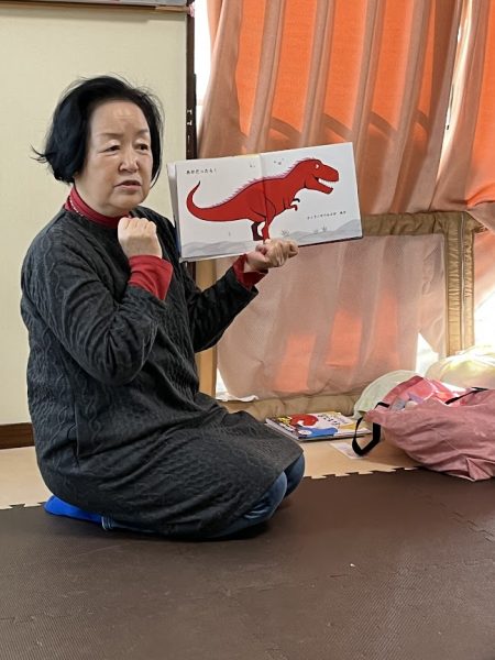 『きょうりゅう、なにいろ?』の本では、もしティラノサウルスが赤だったらどうかな?ステゴサウルスが緑だったら?と自由に想像してみたらどんな色だったのかな?という問いかけに子ども達も自由に色を答えていました☺️✨