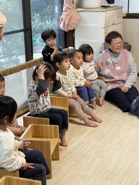 また、ひな壇飾りや子供たちが作ったひな人形製作を背景に集合写真を撮り、ひなあられを食べました。