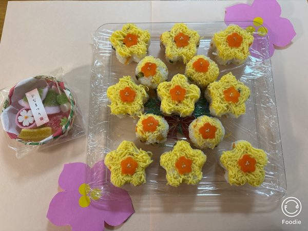 3時のおやつはちらし寿司でした✨調理の先生が春らしくお花を模ったちらしずしを作ってくれました☺️