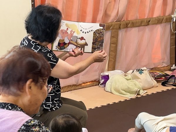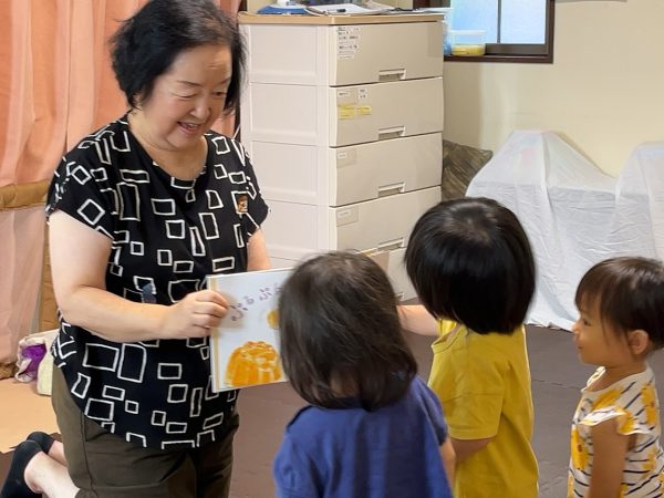 今回も『おいしいおのまとぺ』という絵本では、中田さんが「おいしそうだね、食べてもいいですよ、どうぞ~」と言うと同時に子ども達は絵本に駆け寄りパクパク😋何度も来てはパクパクとニコニコ笑顔の子ども達。